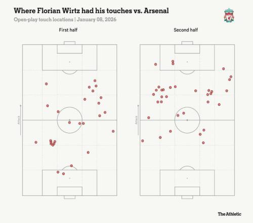 随着阿森纳早期掌控力的松动,利物浦逐渐进入比赛状态,在下半场主导了球权。这部分源于阿森纳似乎满足于退守保住平局,同时维尔茨也发挥了更大影响力,他回撤更深并在球场游弋,与索博斯洛伊完成流畅配合。在一次干净利落的盘带后被特罗萨德阻挡身体,他甚至可能觉得自己未能赢得点球有些遗憾。